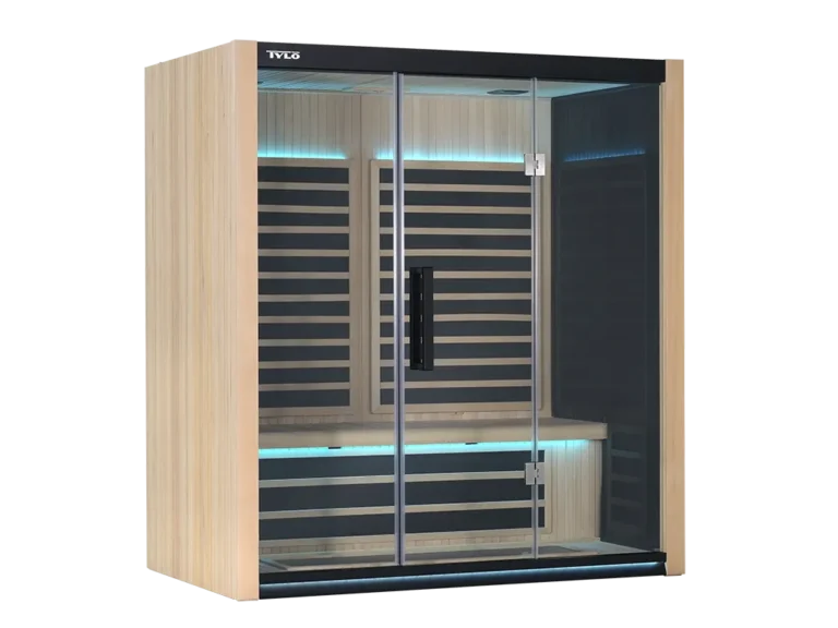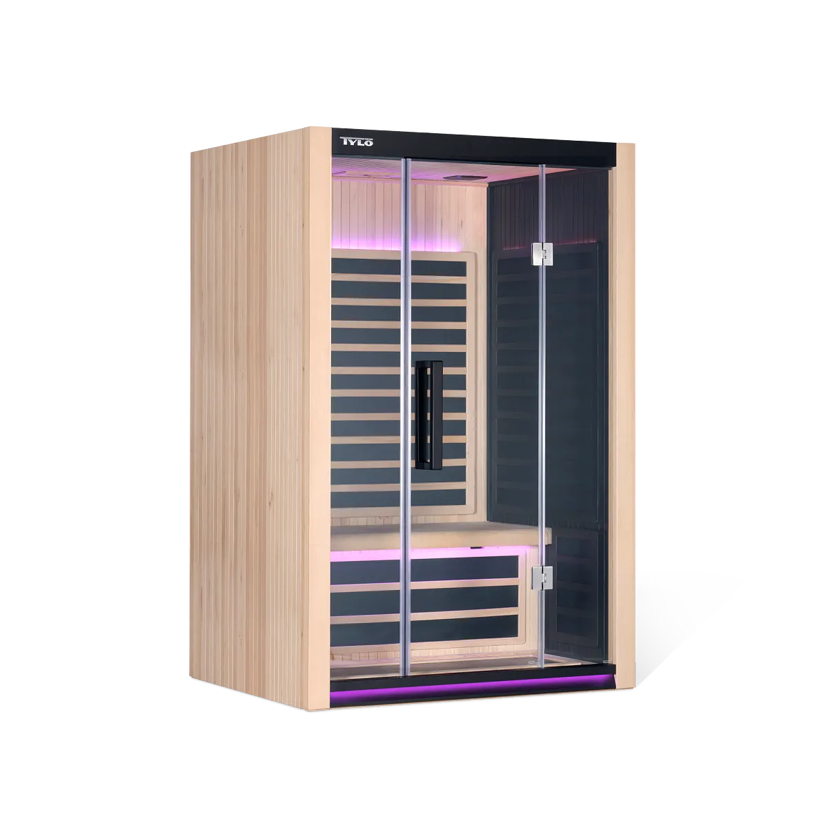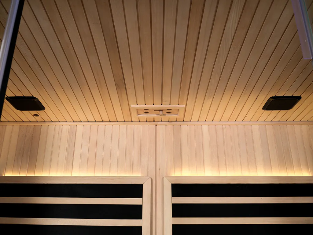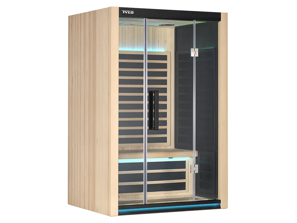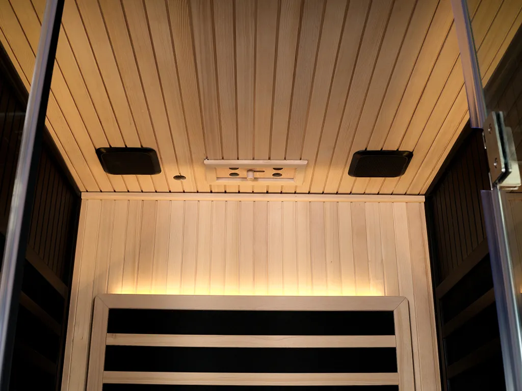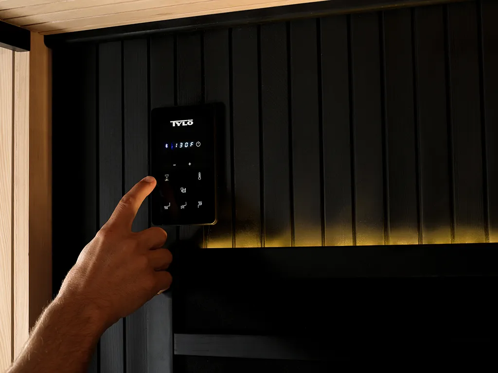 Each sauna includes an Aspire™ touchscreen control panel and seamless connection to the Tylo Sauna App, letting you adjust temperature, session time, lighting, and sound from inside the sauna or remotely.